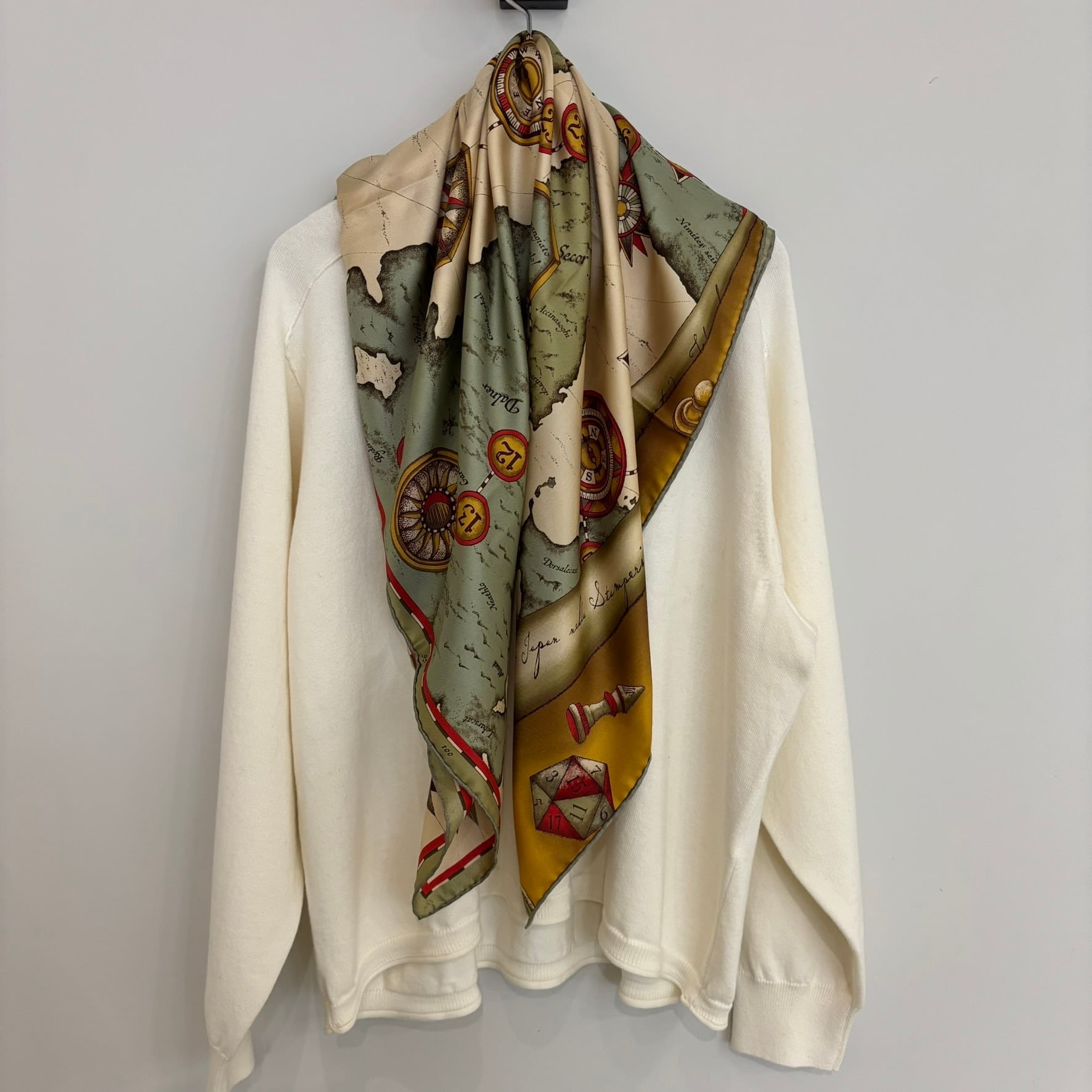 カシミヤ混のスカーフは、日本の職人によって1枚ずつ手捺染めされた後、端を手巻きで仕上げた高級感のあるスカーフです。